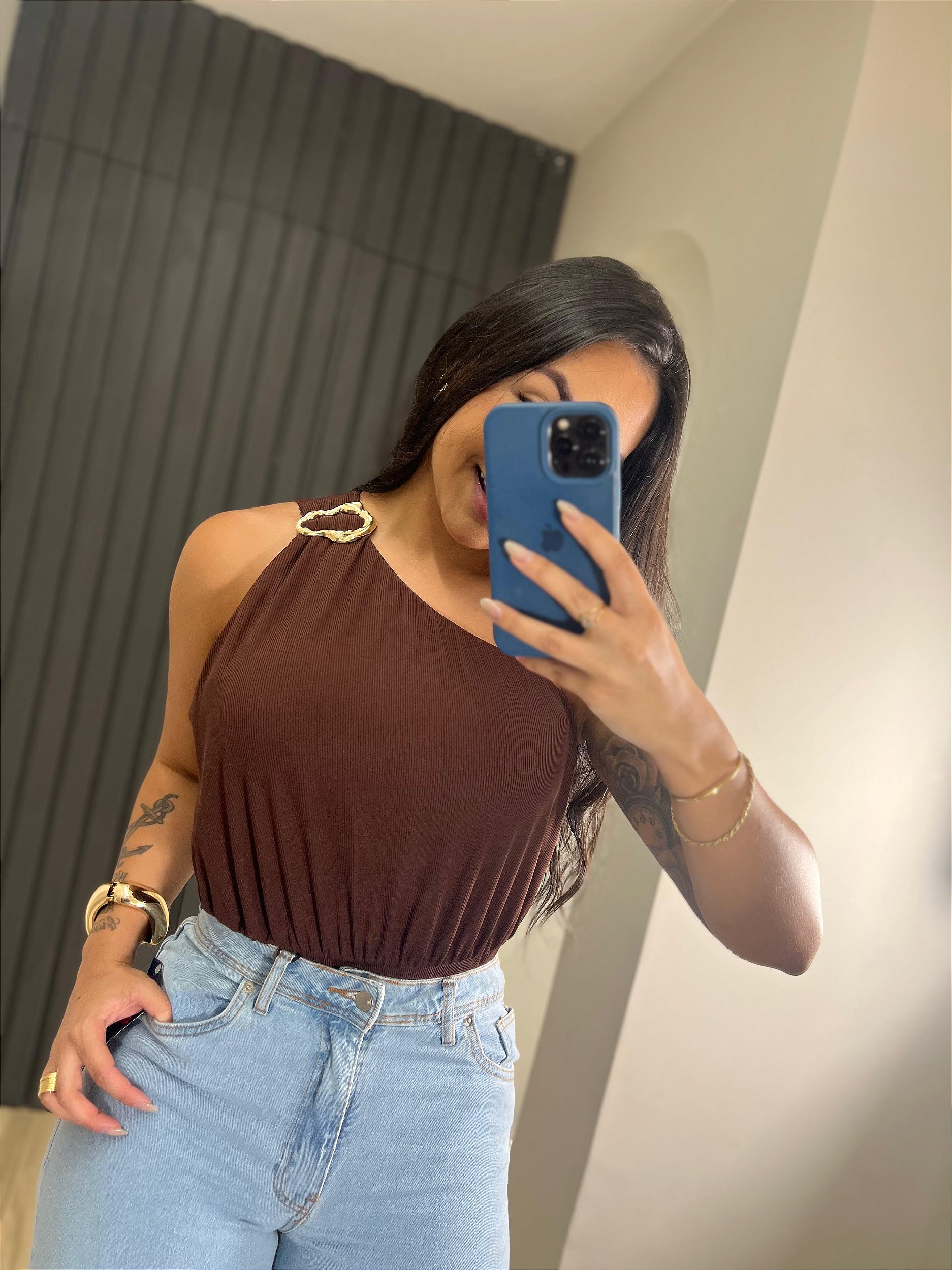 Body ribana premium um ombro só, fivela dourada, drapeado na frente