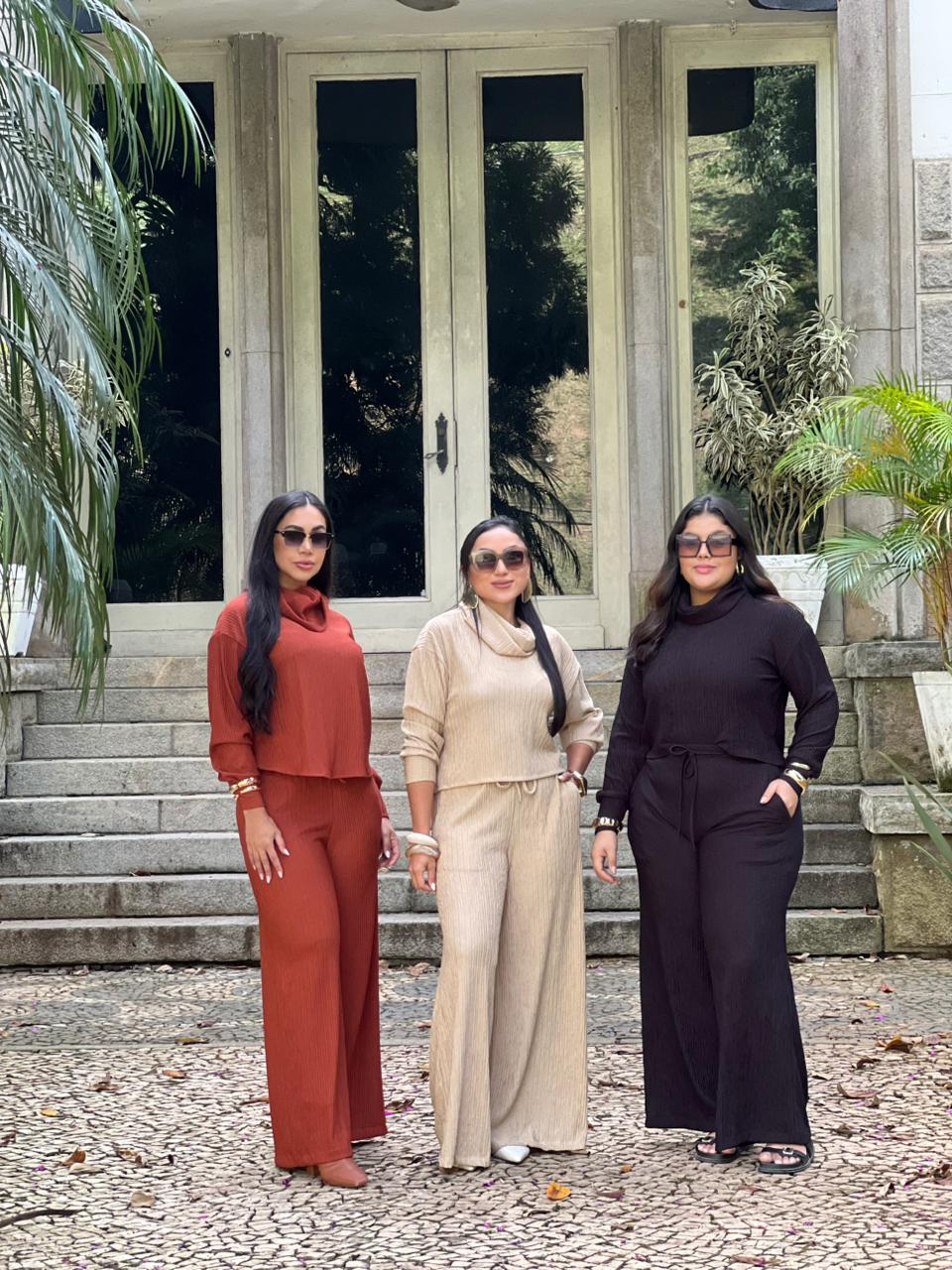 A blusa de mangas longas com gola boba traz um visual elegante e aconchegante, ideal para composições mais refinadas sem abrir mão do conforto. A calça pantalona complementa o conjunto com fluidez e movimento, contando com bolsos laterais e elástico na cintura, garantindo praticidade e ajuste perfeito.
