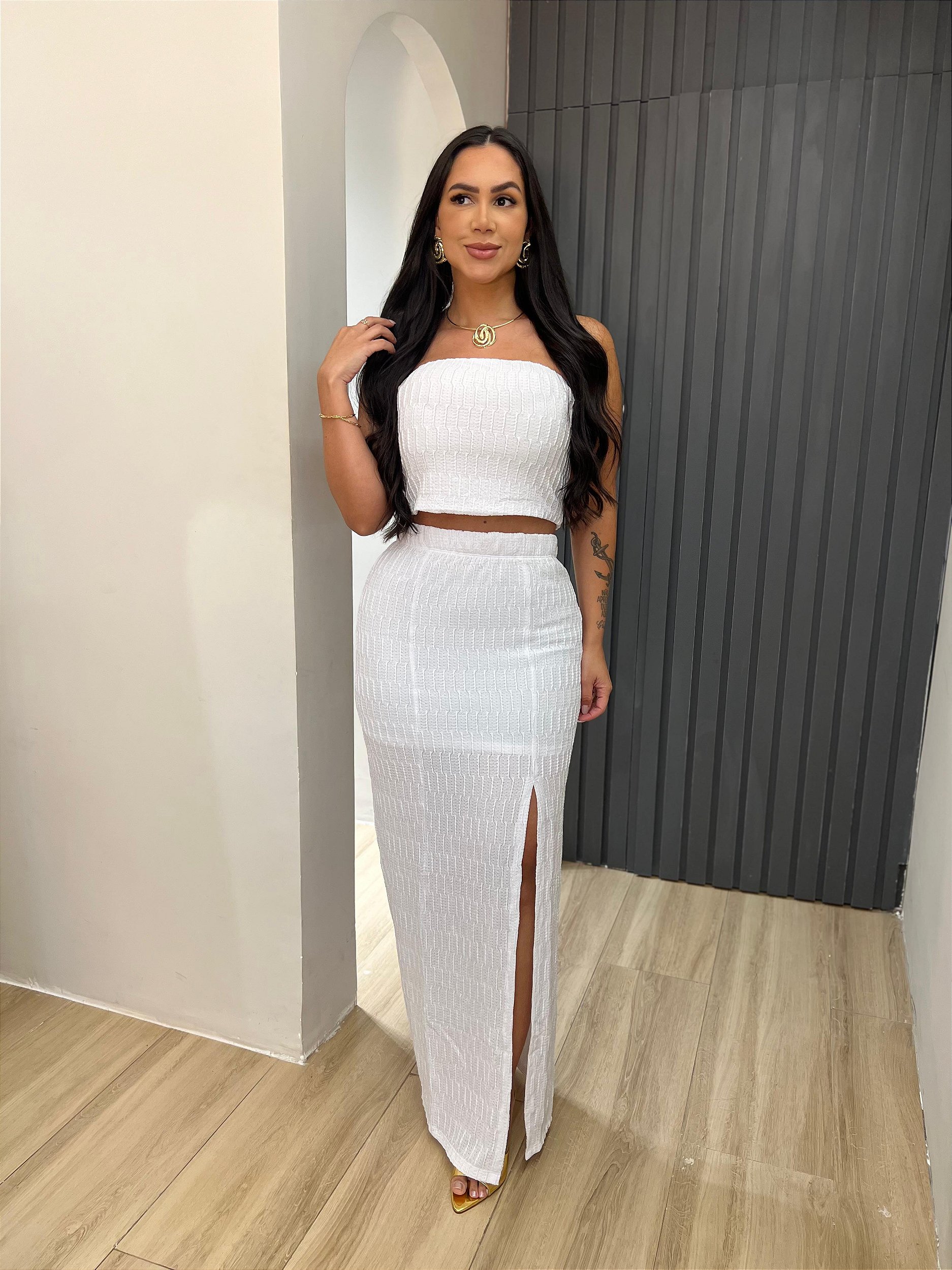 A saia tubinho completa o conjunto com charme e feminilidade. Possui cós com elástico largo, que valoriza a cintura sem marcar, forro interno para maior segurança e uma fenda lateral, que proporciona movimento e um toque sensual na medida certa.