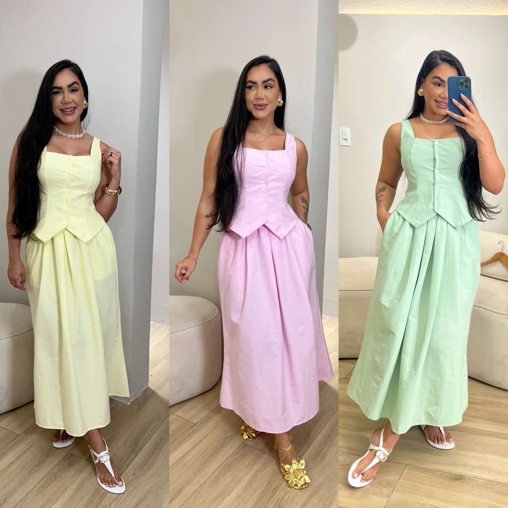 Conjunto de duas peças: Colete regata, com cinco botões de camisa, detalhe em lastex nas costas. Saia com elástico no cós, estilo godê.