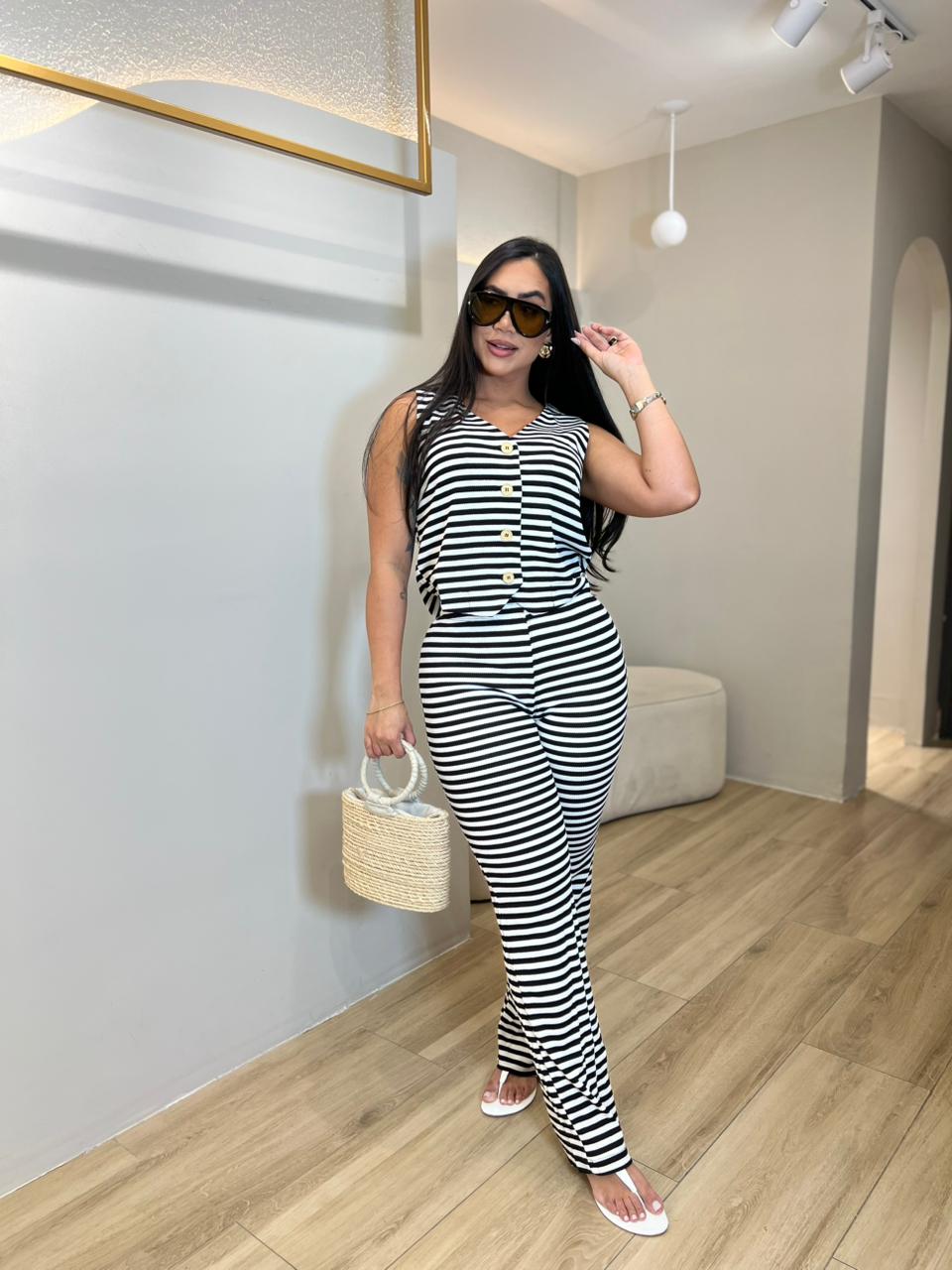 Conjunto listrado confeccionado em malha texturizada, possui elastano. composto por um colete modelado usando técnicas de nadeira.