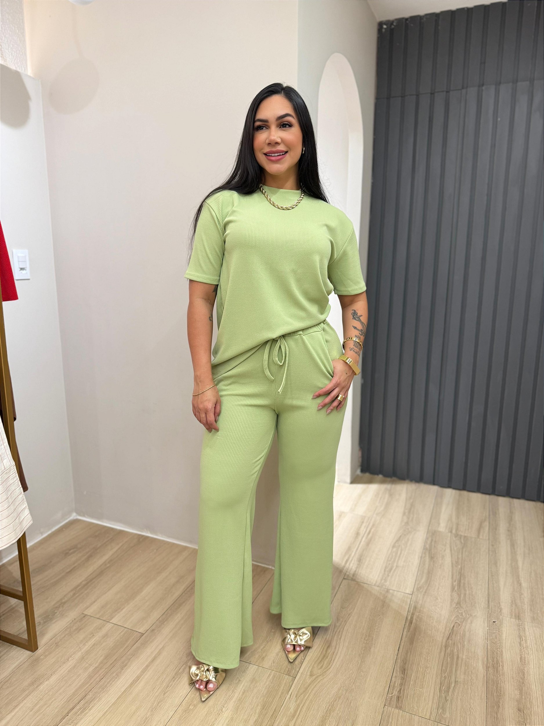 Conjunto com blusa maxi; calça com elastex na cintura, com bolsos funcionais e cardaço para dar laço.