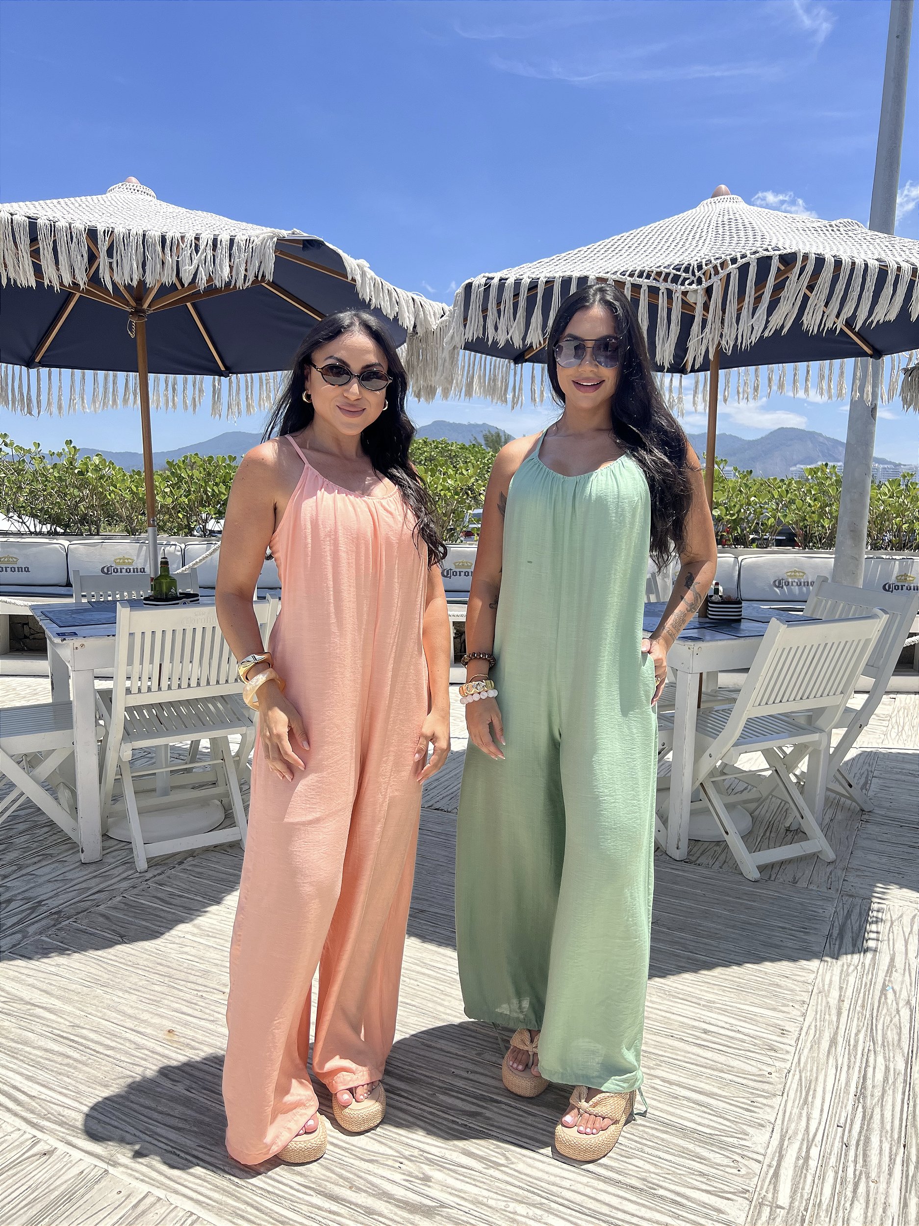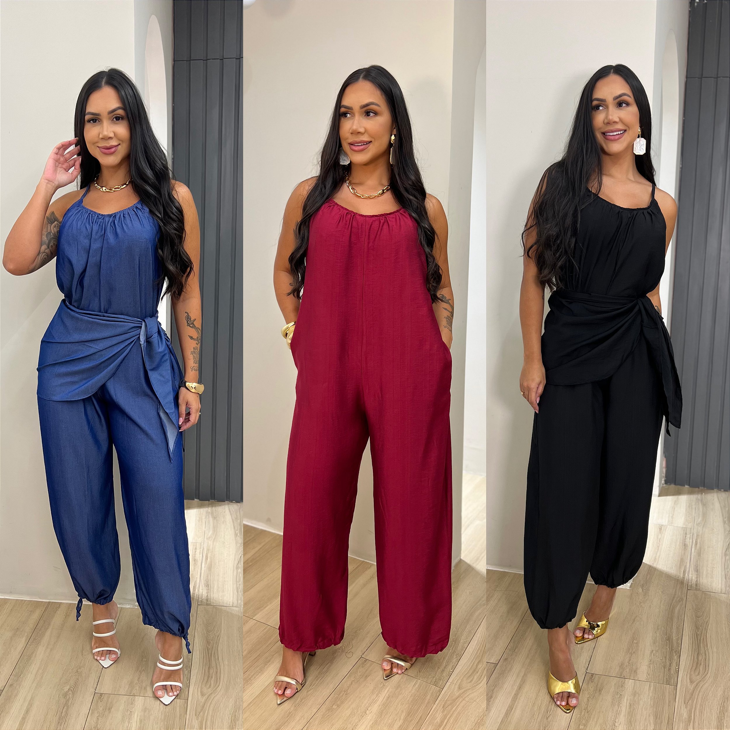 Descrição: Conjunto de macacão multiformas com pareô.