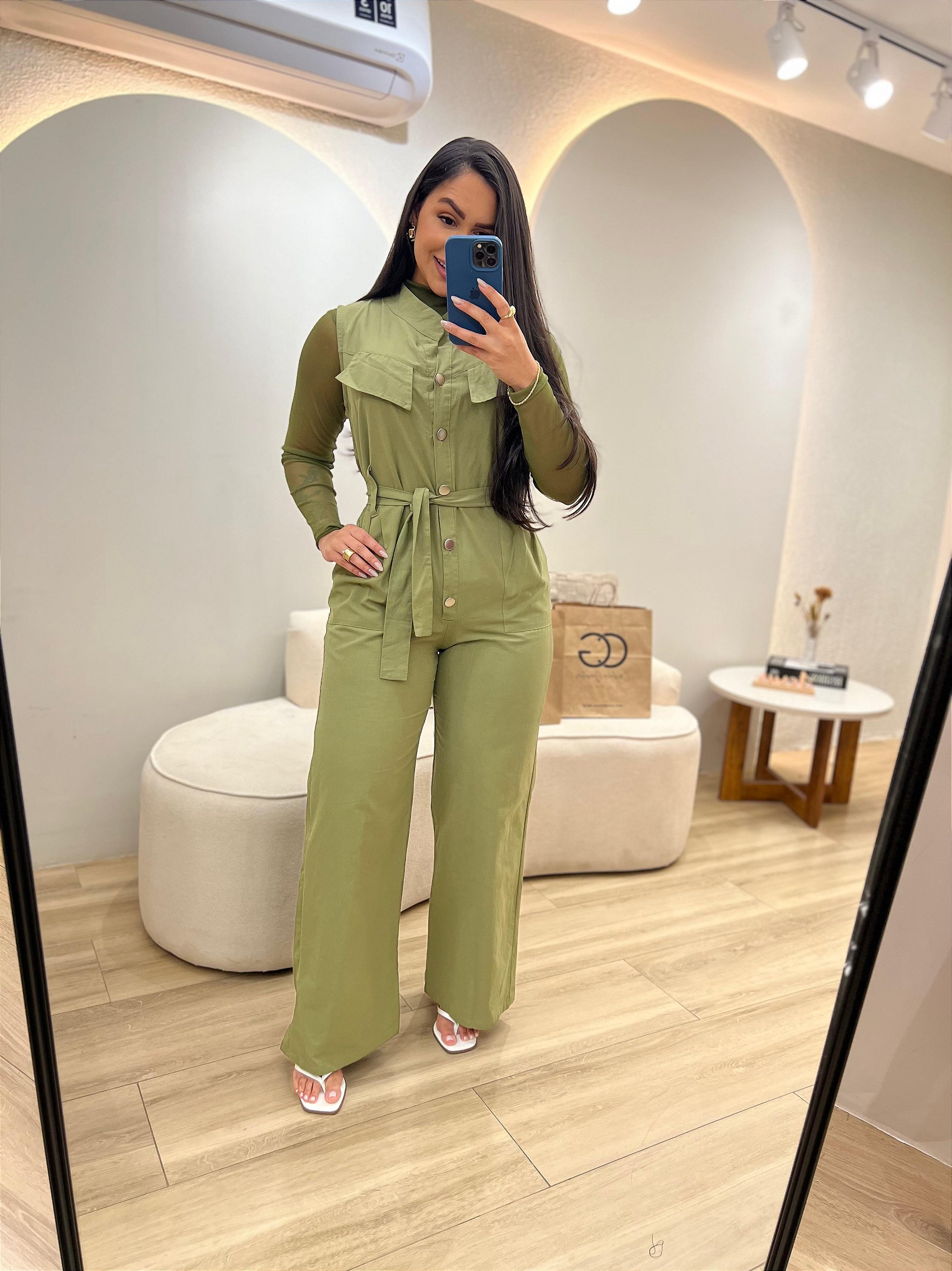 Macacão com botões frontais, com bolsos e acompanha faixa.