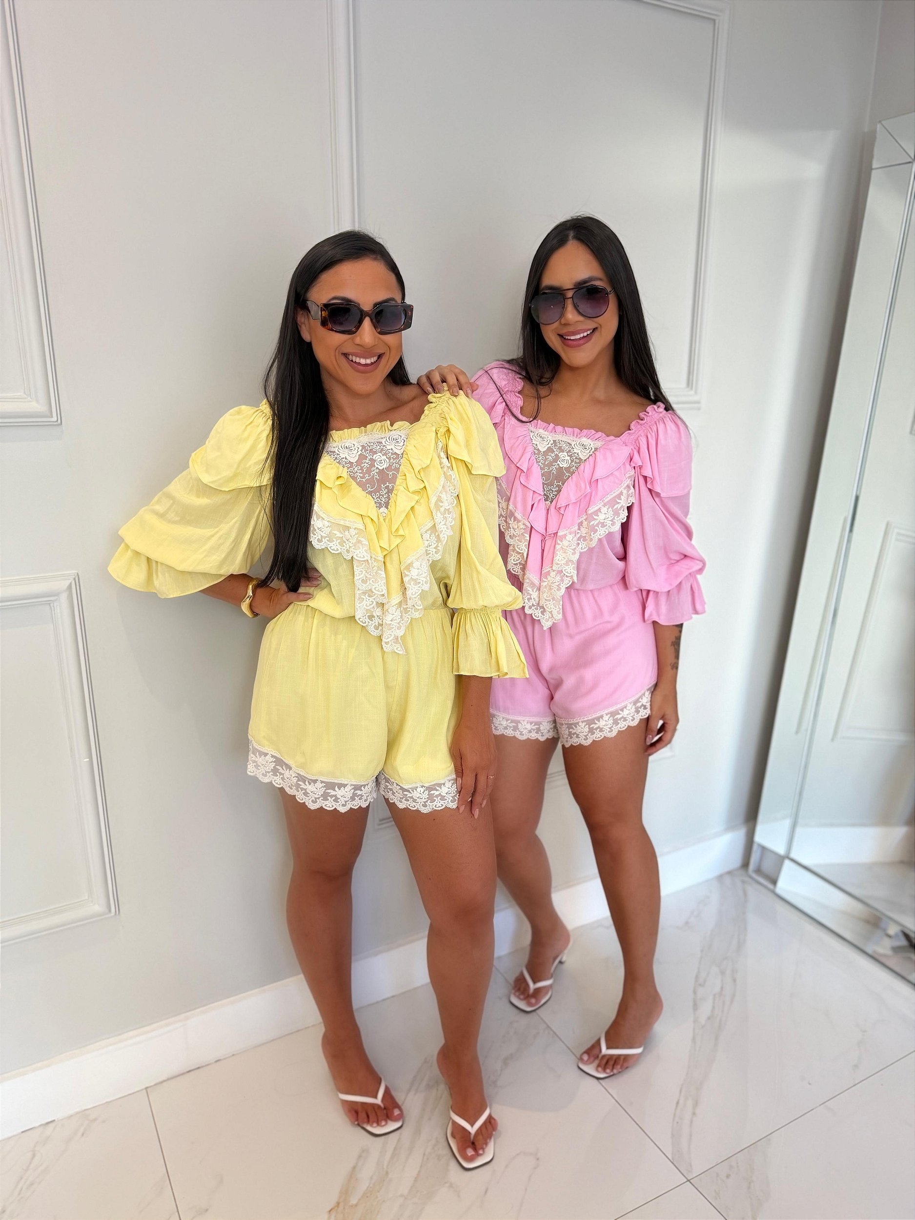 Macaquinho em viscolinho com modelagem fluida e toque leve. Possui decote reto com acabamento franzido e mangas 3/4 bufantes com babado na barra, conferindo volume e feminilidade à peça. O destaque fica por conta da aplicação de babados em camadas na parte frontal, finalizados com delicadas rendas, que também contornam a barra do short.