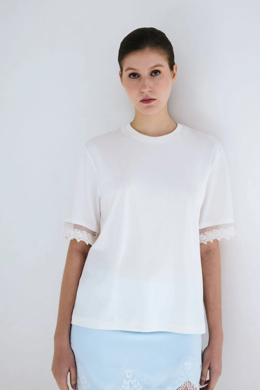 T-shirt em malha 100% algodão, desenvolvida em nossa modelagem clássica que une conforto e versatilidade. O diferencial fica por conta da aplicação de renda no barrado das mangas, detalhe delicado que adiciona feminilidade e sofisticação à peça, sem abrir mão da praticidade do dia a dia.