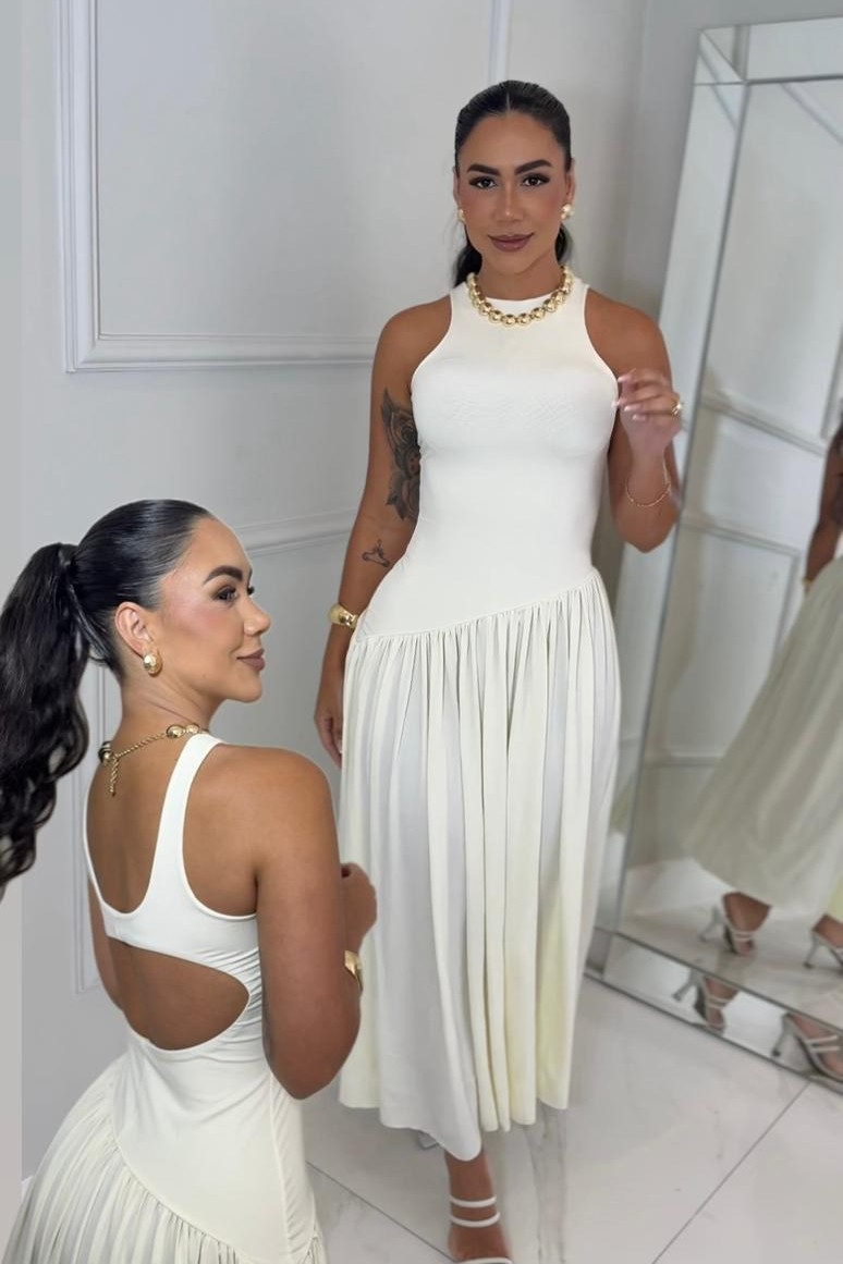 Ele foi desenhado para a mulher elegante que não abre mão do conforto. O caimento impecável, ele não precisa de muito para se destacar, detalhe moderno do recorte nas costas, vomuma silhueta que valoriza o contorno do corpo, detalhe assimétrico , com uma saia de movimento orgânico, ele transita do jantar sofisticado a eventos exclusivos ao ar livre.