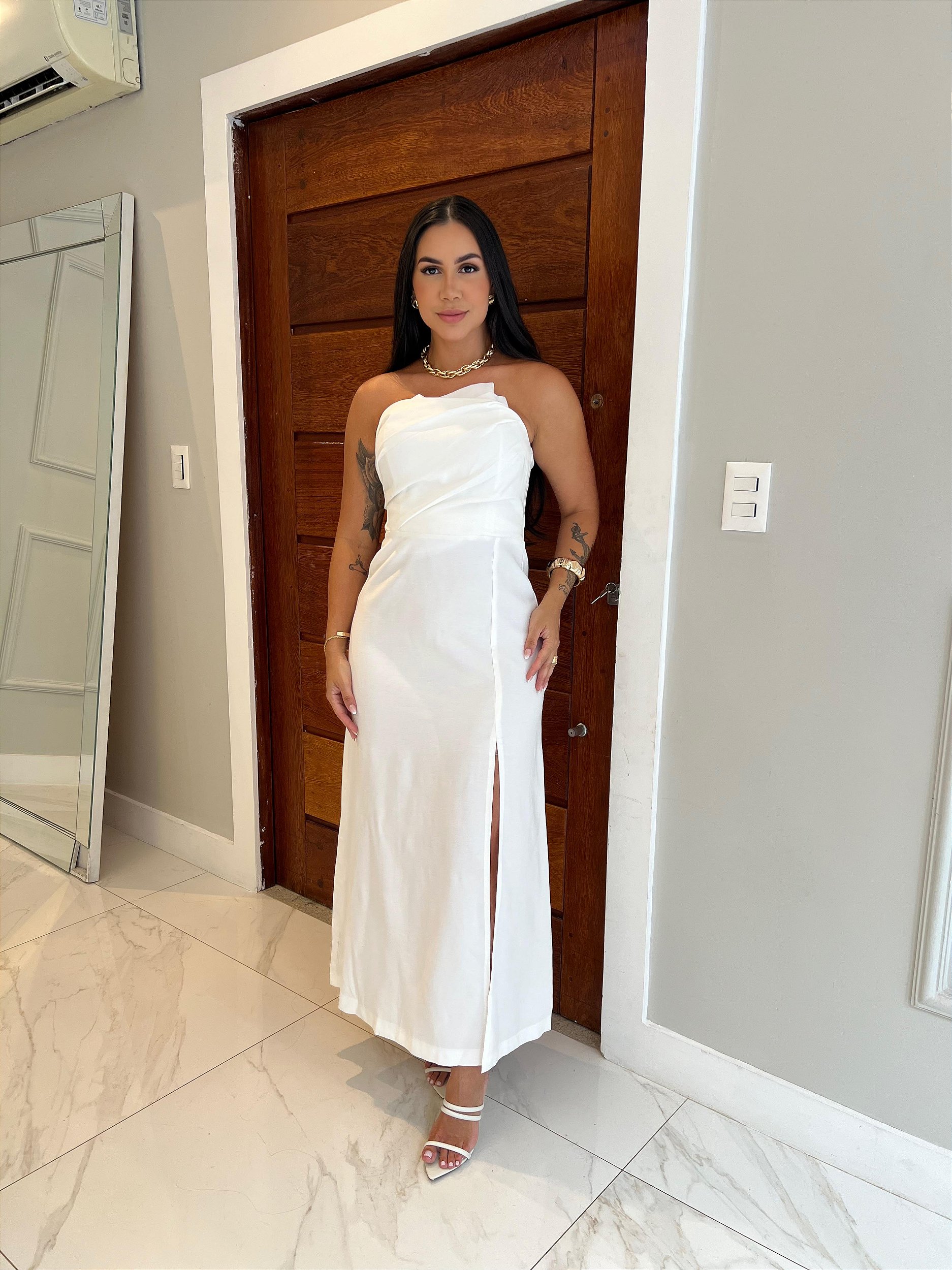 O busto com destaque valoriza o colo de forma elegante, enquanto a fenda frontal acrescenta movimento e sensualidade na medida certa. O zíper e o elastex nas costas garantem melhor ajuste ao corpo e conforto ao vestir.