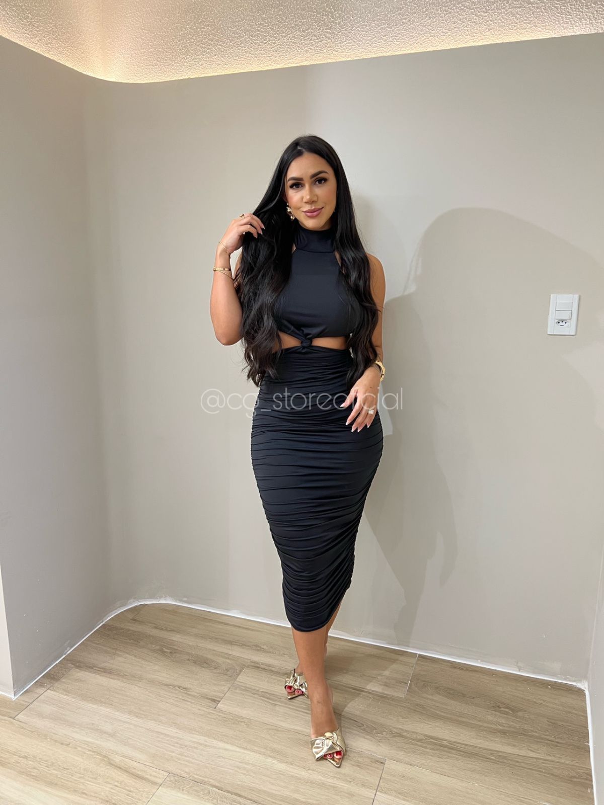 A peça perfeita para quem busca um look elegante e cheio de personalidade. Confeccionado em malha de alta qualidade, este vestido apresenta um decote frente única com gola alta abotoada, além de tiras laterais com canutilho de metal formando um X. O nó na cintura valoriza a silhueta, enquanto a saia franzida midi garante um toque sofisticado.